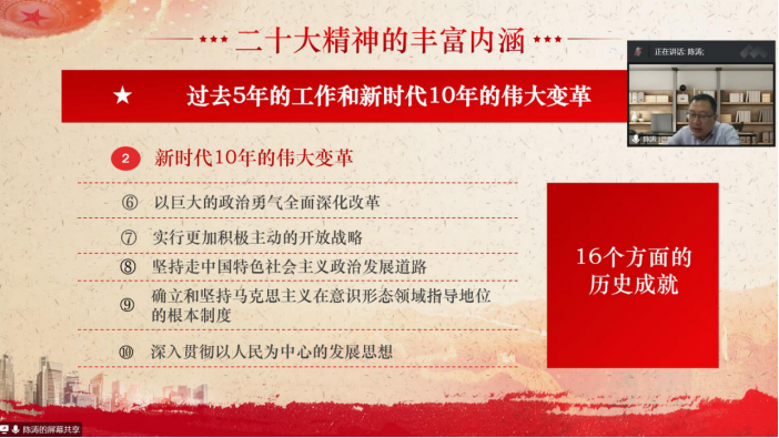 党的二十大胜利召开后,公司领导班子以上率下示范学习、各党支部全面统筹推进学习、员工创新方式载体学习,通过多种形式学思践悟党的二十大精神。为进一步推动党的二十大精神走深、走实、走心,11月25日晚,公司党委书记陈涛通过线上形式为全院教职工讲授《深入学习贯彻党的二十大精神—以中国式现代化推进中华民族伟大复兴》专题学习报告。